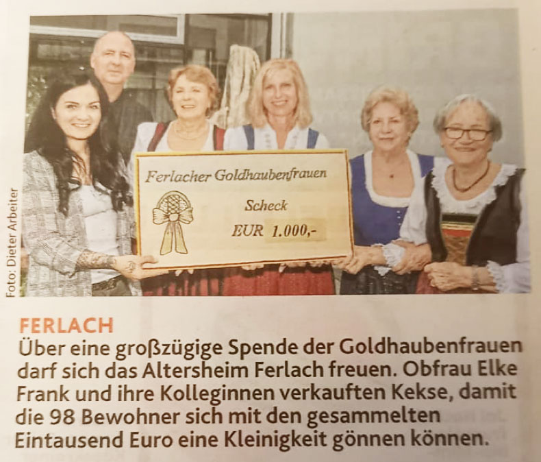 Über eine großzügige Spende der Goldhaubenfrauen darf sich das Altersheim Ferlach freuen. Obfrau Elke Frank und ihre Kolleginnen verkauften Kekse, damit die 98 Bewohner sich mit den gesammelten Eintausend Euro eine Kleinigkeit gönnen können.