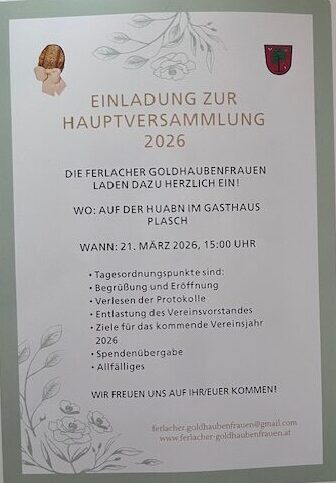 Die Ferlacher Goldhaubenfrauen halten alljährlich ihre feierliche Hauptversammlung auf der „Huabn“ im traditionsreichen Gasthaus Plasch ab. Diese Zusammenkunft bildet einen wichtigen Höhepunkt im Vereinsjahr, bei dem das vergangene Jahr noch einmal in würdiger Weise in Erinnerung gerufen wird. In einem Rückblick werden die zahlreichen Aktivitäten, Begegnungen und besonderen Momente des Vereinslebens vorgestellt.